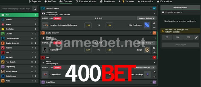 O 400Bet oferece uma grande seleção de opções de apostas em e-sports com probabilidades competitivas